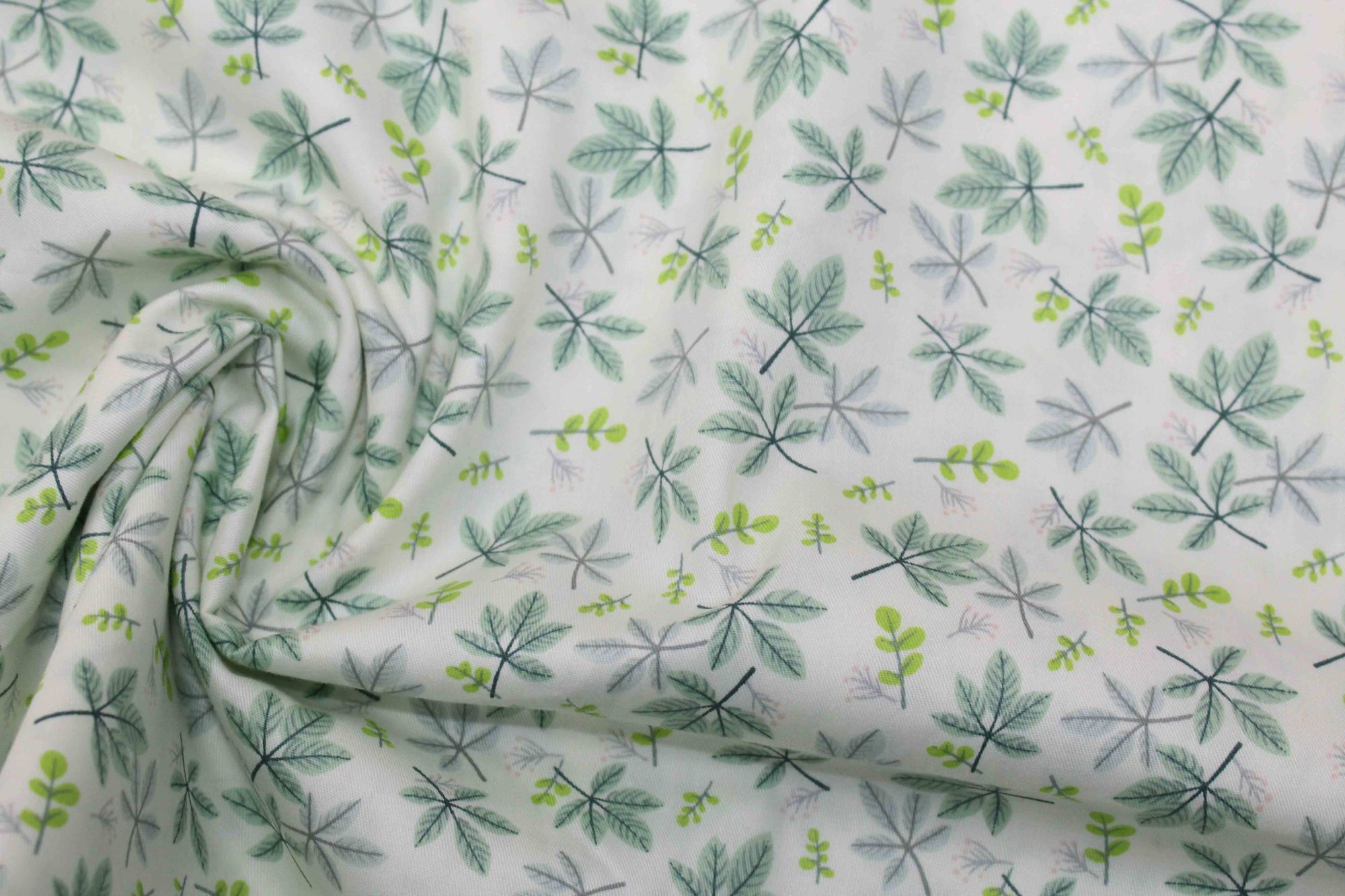—Хлопок сатин плотный принт/листья мятные на молочном 20205/C#9 50 пог/м.