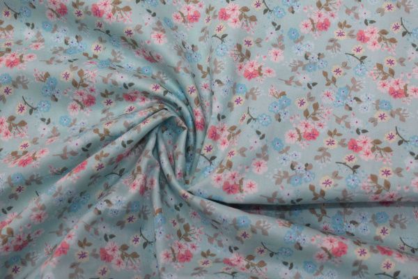 Хлопок сатин плотный принт/цветы розовые на голубом 20205/C#11 50 пог/м.