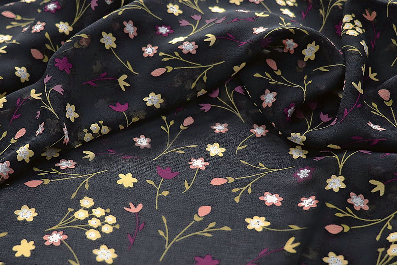 Шифон принт/цветы желто-фиолетовые на черном 2866-20-PY/D#4/C#8 (10575) 25 пог/м.