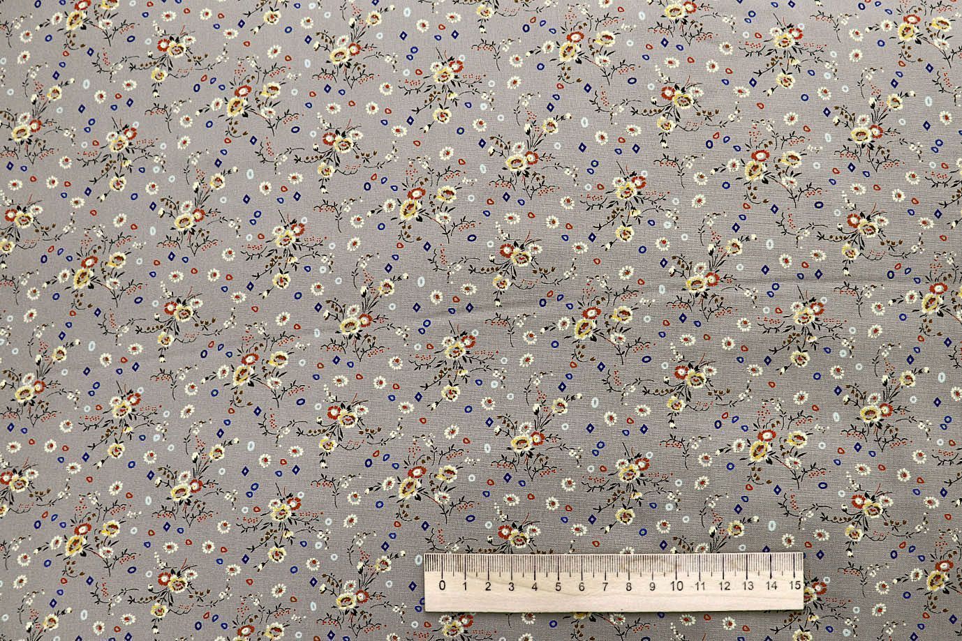 —Штапель принт/цветы красно-желтые на сером 1443-PY/D#4/C#5 33 пог/м.