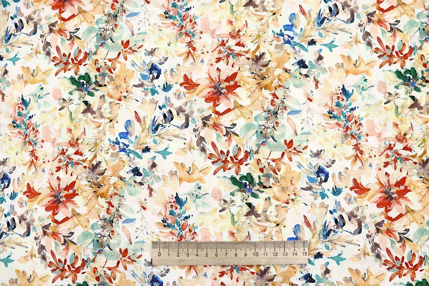 Штапель принт/цветы оранжево-синие на молочном 4205-PY/D#26/C#1