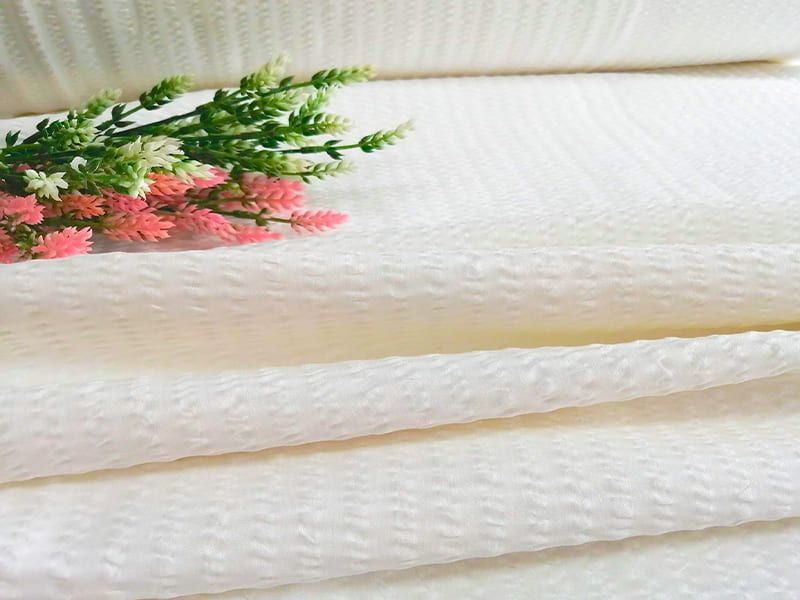 Название плотной ткани дала ее «мятая» структура». Подобный эффект достигается несколькими способами: особым вариантом скручивания нитей и обязательной термообработкой. Несмотря на мятость, материал не выглядит как нечто неопрятное, а напротив – изгибы и заломы оставляют на ткани экзотический узор, который и считается изюминкой материи.